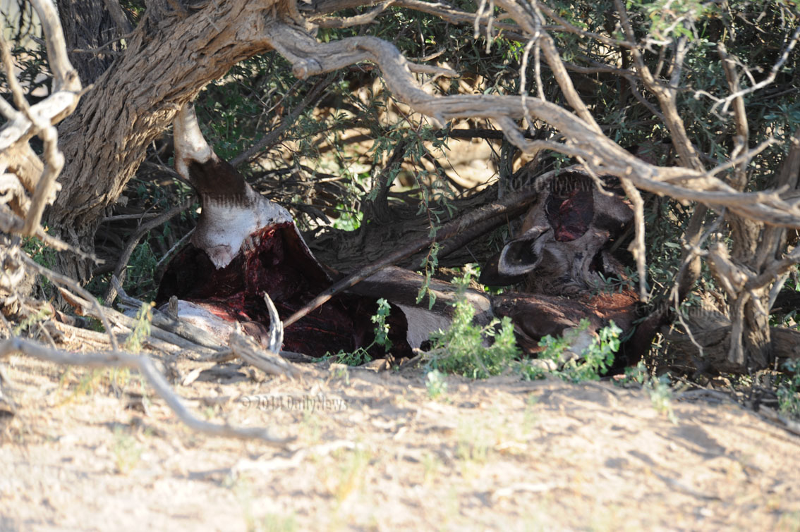 The carcass looks fresh and most of it has been tucked under a tree canopy for a late evening snack perhaps.