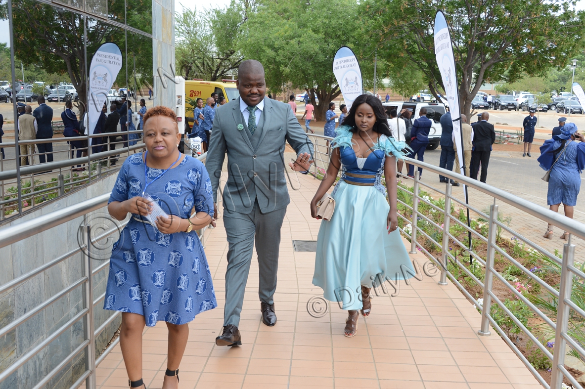 President Dr Masisi wore a red tie and white shirt with his well-tailored suit, and their daughter Atsile was clad in a dress matching the colour of her Mum’s.
