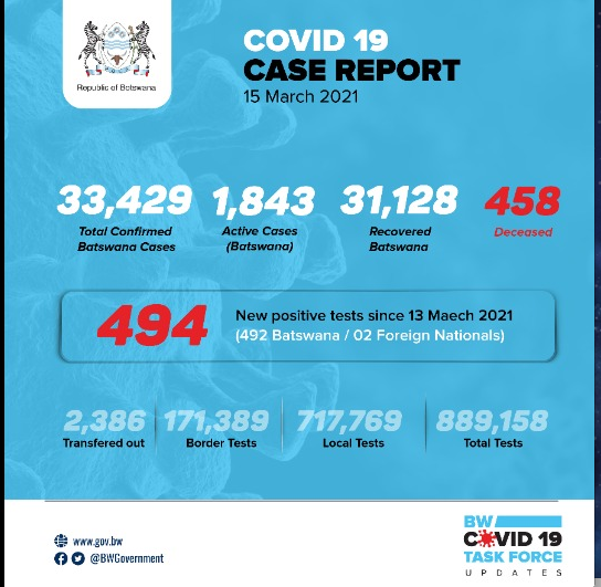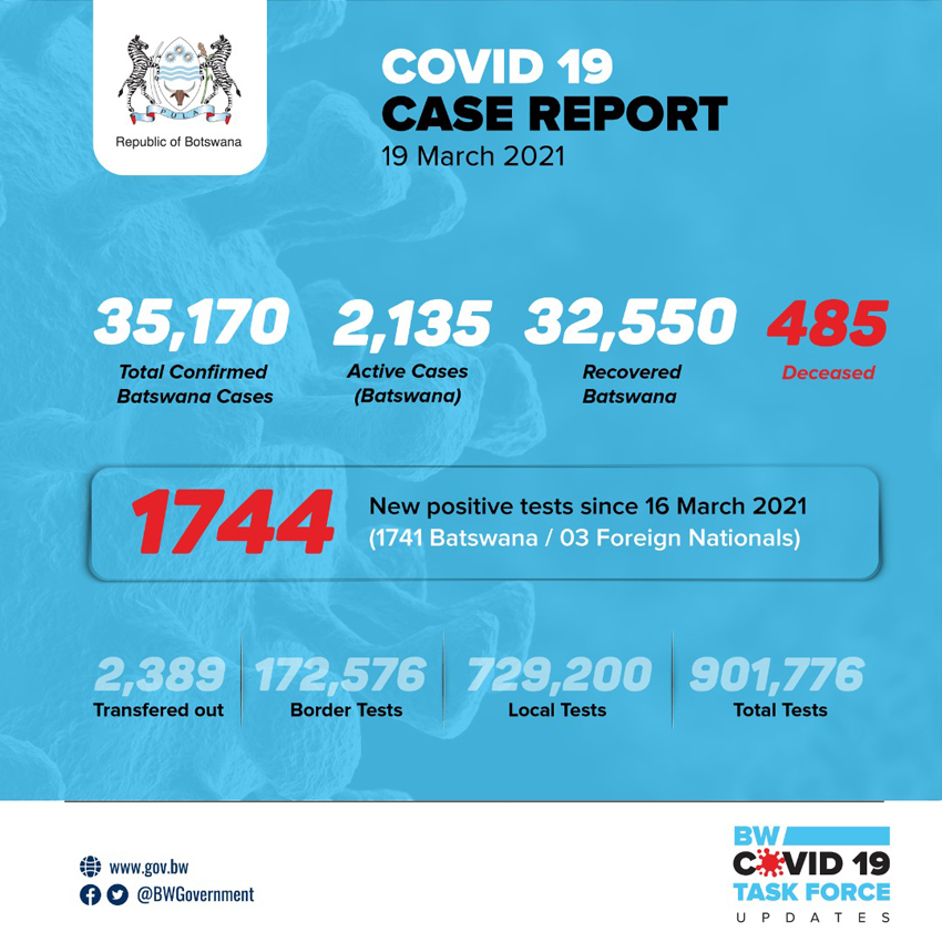 New positive cases increased from 494 to 1 744. Of the positive cases reported today, 1 741 are Batswana while three are foreign nationals.