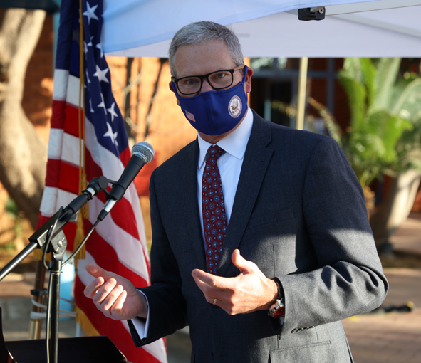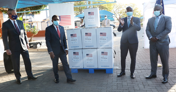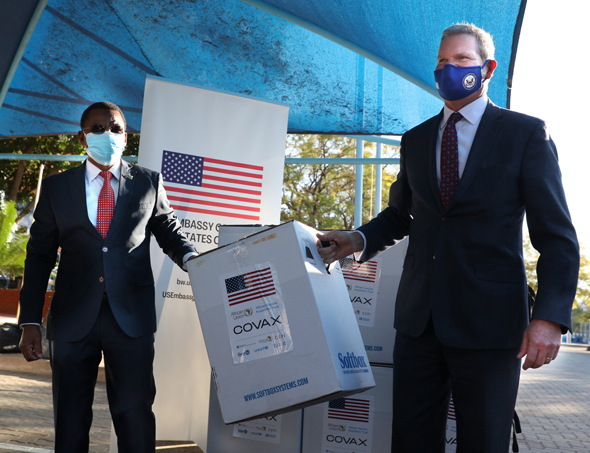 Vice President, Mr Slumber Tsogwane receiving 81 900 doses of the Pfizer COVID-19 vaccine from the US ambassador, Mr Craig Cloud at the handover ceremony in Gaborone on Friday. Mr Tsogwane said to date, more than 260 000 people have received their first dose while just over 160 000 of those being fully vaccinated.