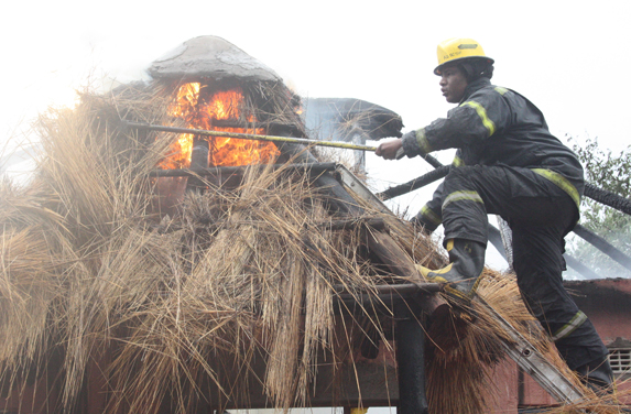 Fire Brigade extinguishing fire from a hut in Tatisiding on Tuesday evening.
