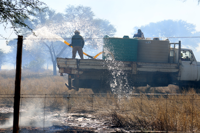 An unsightly black thicket covered the earth as the fire fighters continued to pour water and beat parts which were still burning. At the spot, Mr Seoko, was joined by four Camel Ecotourism Park employees, Messrs. Mosimaneotsile Maruping, Kabo Keseeme, Tlotlanang Cooper and Kealeboga Masetlane. Meanwhile, Department of Forestry and Range Resources, Fire Department employees, small stock farmers and the Office of the District Commissioner disaster management committee were spread out fighting the fire in other paddocks.