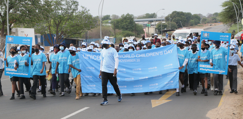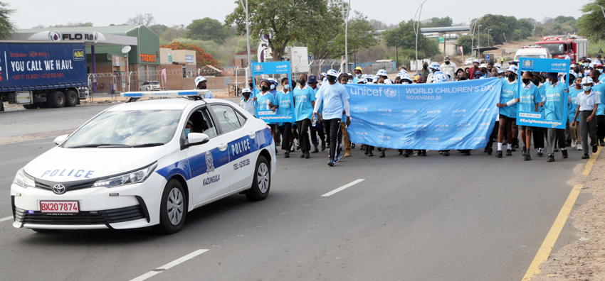 Some primary schools pupils in a 4km march in Kasane on Friday as a build-up activity for World Children day to be commemorated today. Four Heads of states from SADC countries; Botswana, Namibia, Zambia and Zimbabwe are expected to attend today's the event. The commemoration is organized by UNICEF under the theme reimagining the future. World Children's Day is celebrated on November 20 annually to commemorate the signing of Declaration of the Rights of the Child by the UN General Assembly. Photo: Gaseitsiwe Moruakgomo