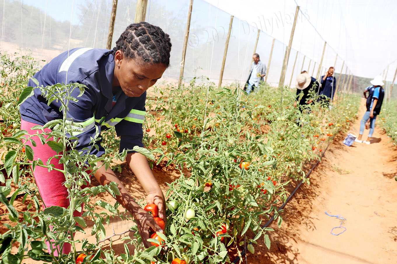 I never imagined I could bury a seed and it would grow. After seeing a Motswana grow cucumbers in Shakawe, I realised that was also possible to do it in Kgalagadi,” she says, as she gently ties a string, then winds it around the branches of a tomato tree before tying it up on the lattice.