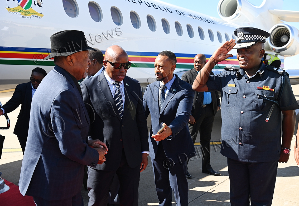 Namibia President, Mr Nangolo Mbumba arrived in Gaborone this afternoon to attend the late President Dr Hage Geingob’s memorial service to be held at GICC on March 13. He was welcomed at Sir Seretse Khama International Airport by Minister for State President, Mr Kabo Morwaeng and Minister of Defence and Security, Mr Kagiso Mmusi. This is President Mbumba’s first official visit to Botswana since he was sworn in after the passing on President Geingob. Photos: Yobe Shonga