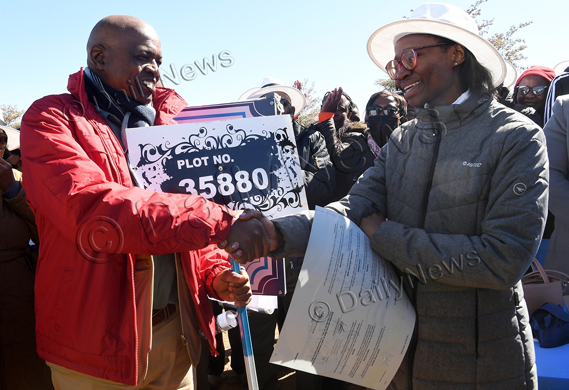 The 100 000th residential plot was officially handed over to 27-year-old Ms Game Leesemane by President Dr Mokgweetsi Masisi at Losabanyana ward in Kanye on Tuesday . The handing over of the plot marked the completion of the two-year exercise, which the President had tasked the Ministry of Lands and Water Affairs with in 2022.