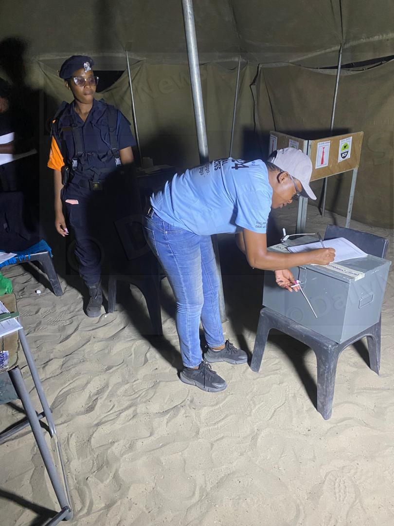 Presiding Officer at Old Tribal Administration Centre poling station in Gumare, Ms Phono Maseko, sealing a ballot box.