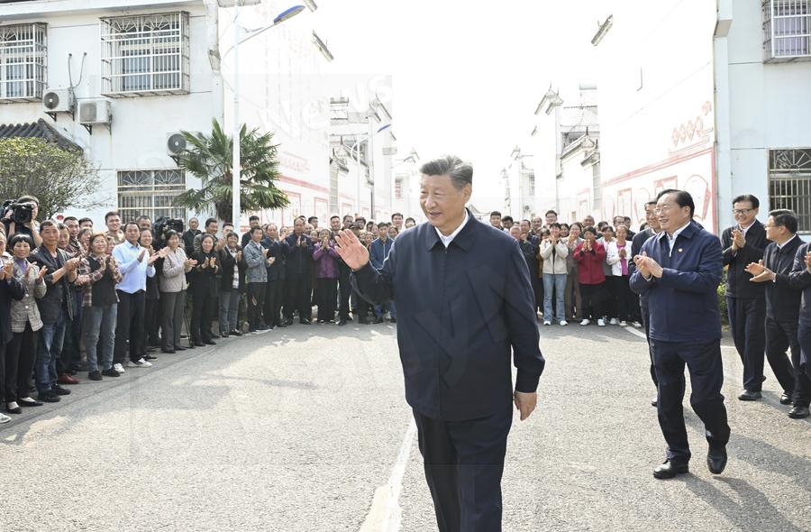 Xi Jinping, also general secretary of the Communist Party of China Central Committee and chairman of the Central Military Commission, waves to villagers as he visits Siyi Village in Panjiawan Town of Jiayu County, Xianning, central China's Hubei Province.