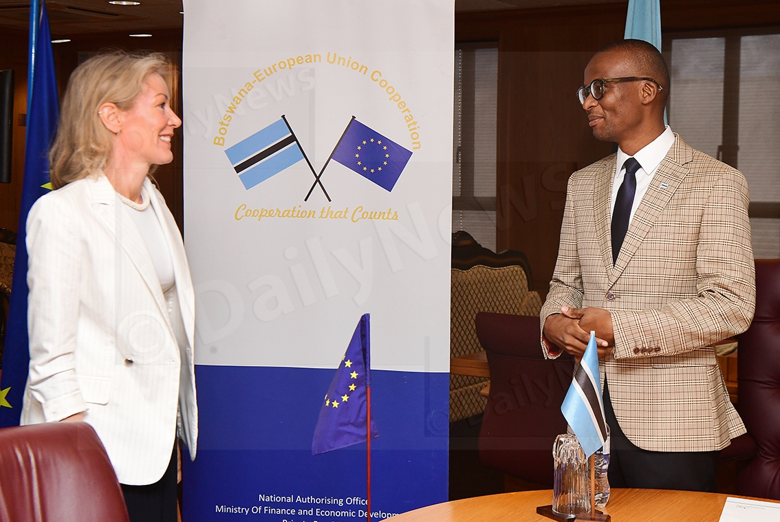 European Union Ambassador to Botswana and SADC, Ms Petra Pereyra made a courtesy call to Vice President and Minister of Finance, Mr Ndaba Gaolathe in Gaborone yesterday.