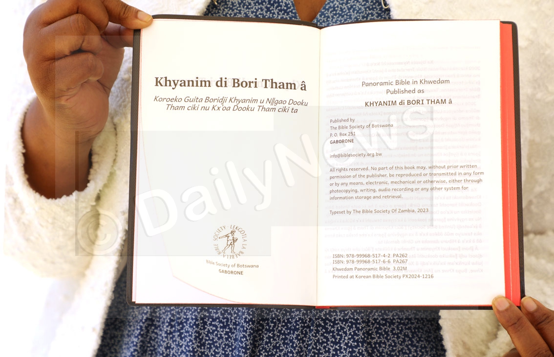 Se se builwe ke mogolwane wa Bible Society of Botswana, Mme Tumelo Tlhong kwa Tobera bosheng fa go ribololwa Baebele ya puo ya Khwedam bosheng.