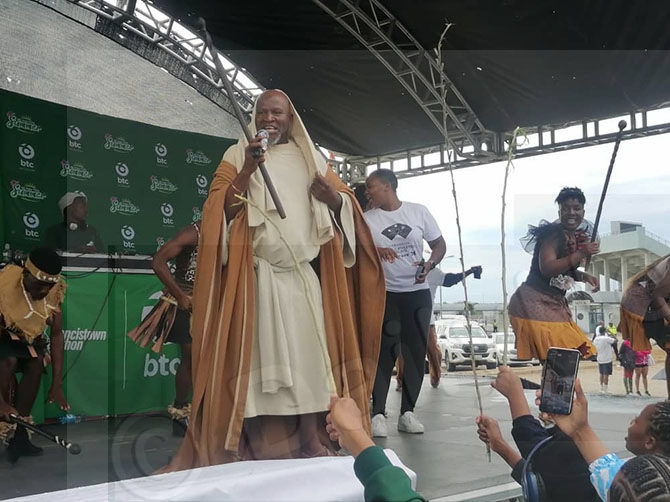 Then Kangangwani Magocha ‘Dr Vom’, stepped onto the stage in his trademark, dikhwaere attire and the 5th BTC Francistown Marathon exploded.